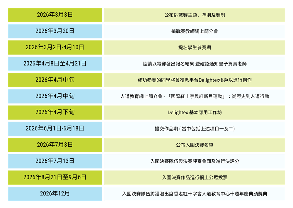 - 初賽入圍決賽結果將於2026年7月3日早上九時於香港紅十字會人道教育中心- 生活人道Facebook 專頁 及 Instagram 帳戶公布
