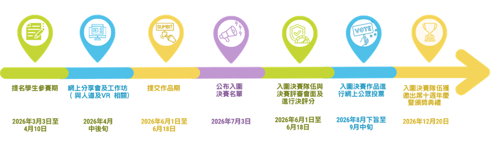 - 主辦單位會於比賽各階段進行攝影及錄影,並有權採用參賽者的影像,例如圖片、影片、文字、活動照片、海報、圖像或音訊等作活動記錄、教育或宣傳用途。參與學校於學校通告中亦宜加上此附註。